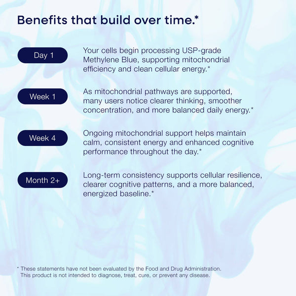 Methylene Blue is respected throughout the wellness, nootropic, and longevity communities for its ability to support healthy mitochondrial function, efficient cellular energy production, and optimal cognitive performance. By helping the body maintain balanced cellular processes, it can promote mental clarity, focus, mood balance, and sustained energy throughout the day. Its antioxidant properties further support longevity and overall resilience, making it a staple for wellness seekers who prefer clean, science-aligned formulations.